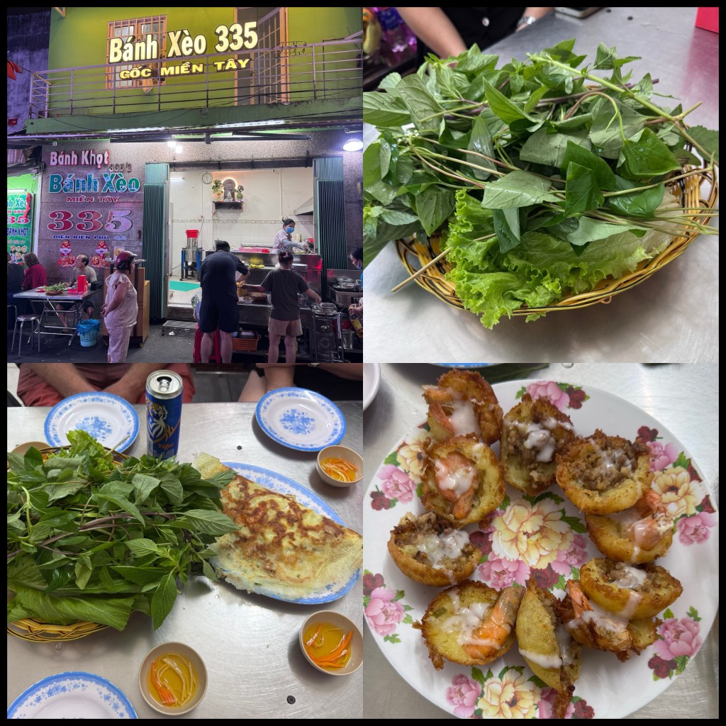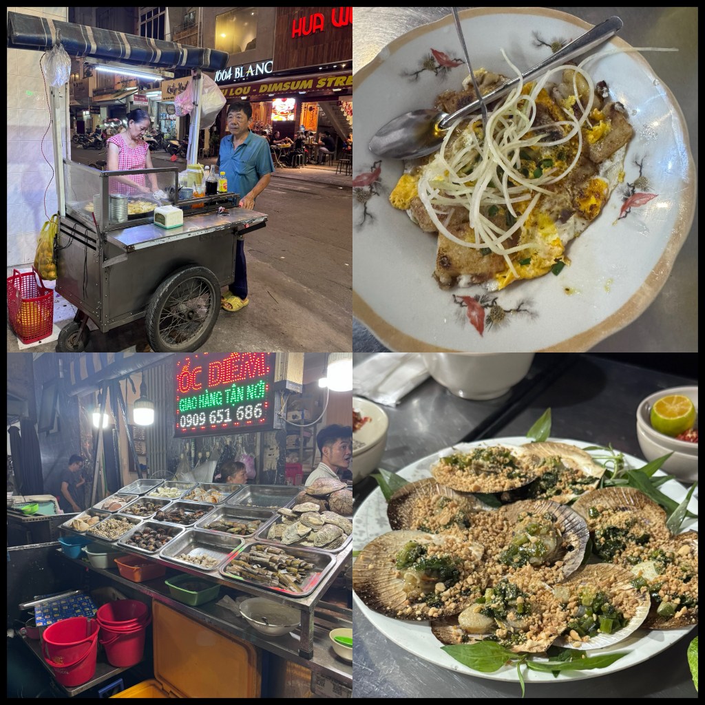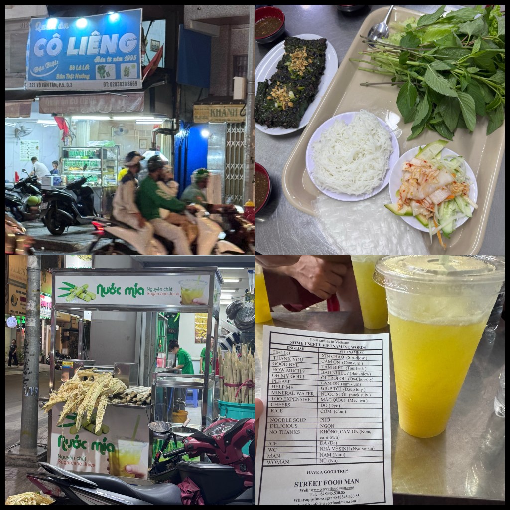 Street food tour: Co Lieng (betel leaves), Nuac Mio (sugar cane juice and rice flour noodles opposite), Oc Diem (seafood alley), Bahn Xeo 335 (big and small savoury pancakes), Kem Bo (coconut icecream smoothie)