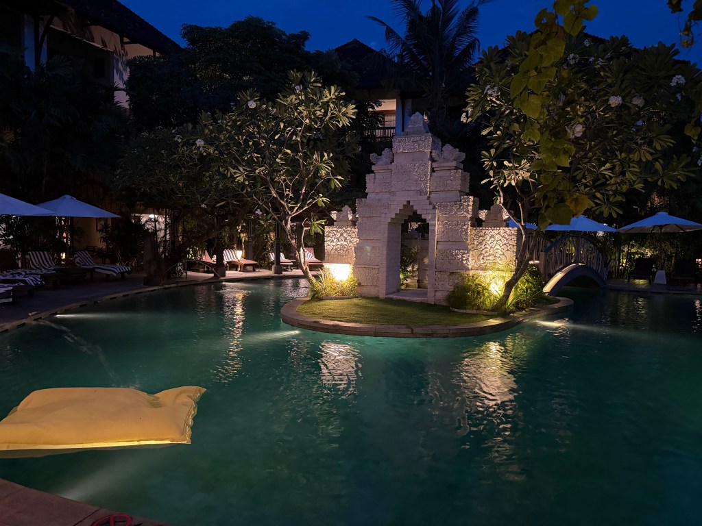 While we do have a private pool, we also have access to this gorgeous hotel pool and a swim up bar. We ate at the onsite restaurant for night one and the indo food options were only a small part of the menu but they were delicious.