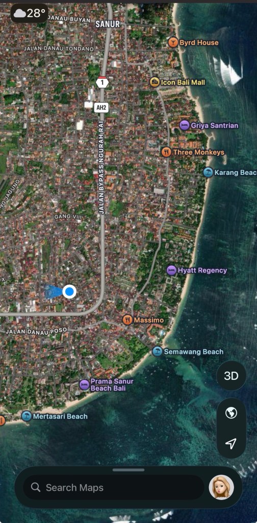 So to show you where we stayed this time here’s the map. You can see here at Alantara Sanur we are much further inland and on the other side of the bigass highway which is not a fun process to cross. Price wise it was comparable to smaller places closer to the beach which surprised me….but no resort features so I see the trade off.