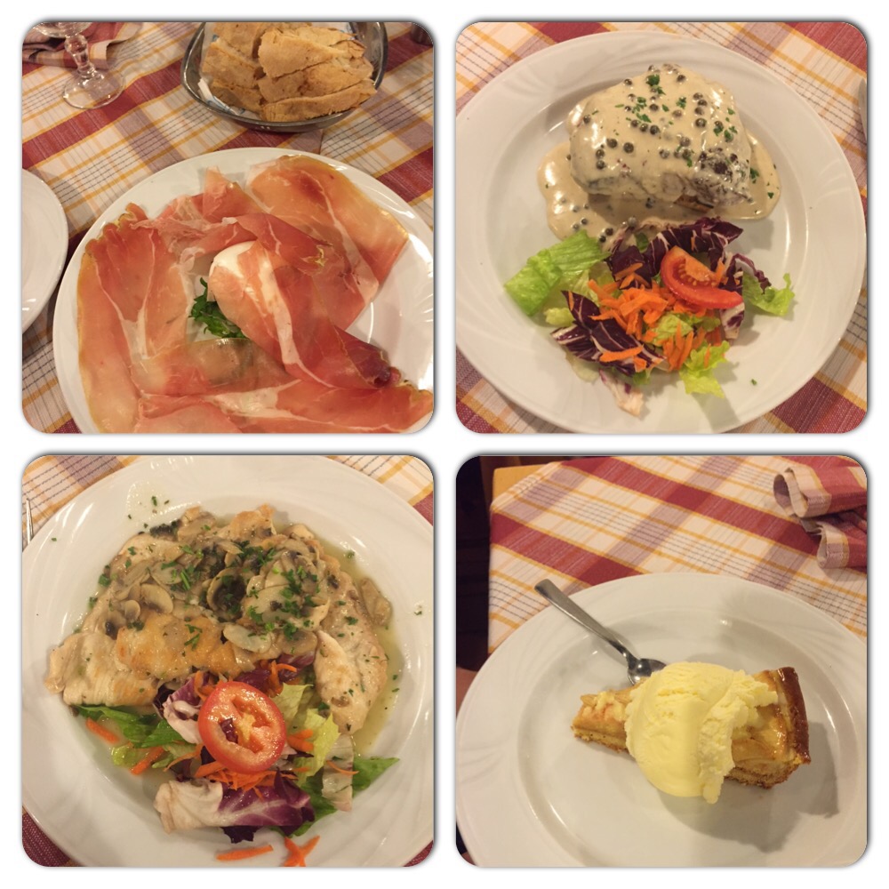 entree: prosciutto and mozarella (addictive), mains: steak with creamy peppercorn sauce and chicken with mushrooms, dessert: apple pie!