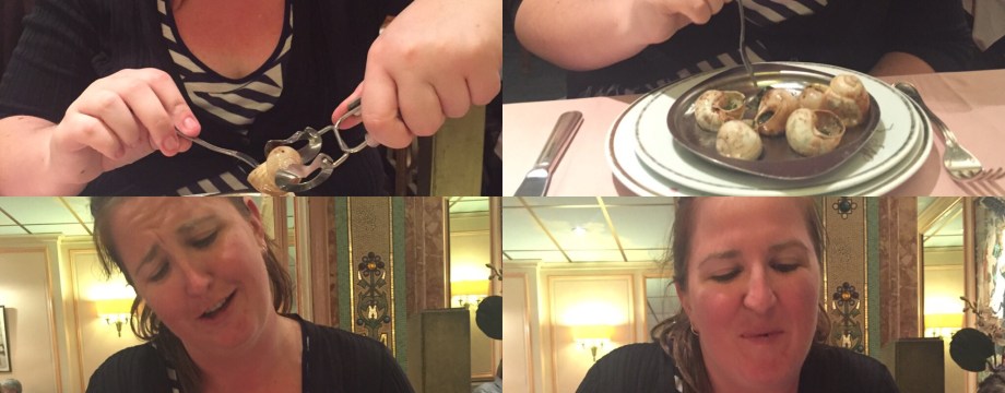 After a rest at the hotel, it was dinner time again. I think dinner time is my favourite time in Paris…so much good food. Tonight we went to Mollard and I ate escargot. In their shells! Here’s some actin shots of me attempting to conquer my fear of snails by eating them: