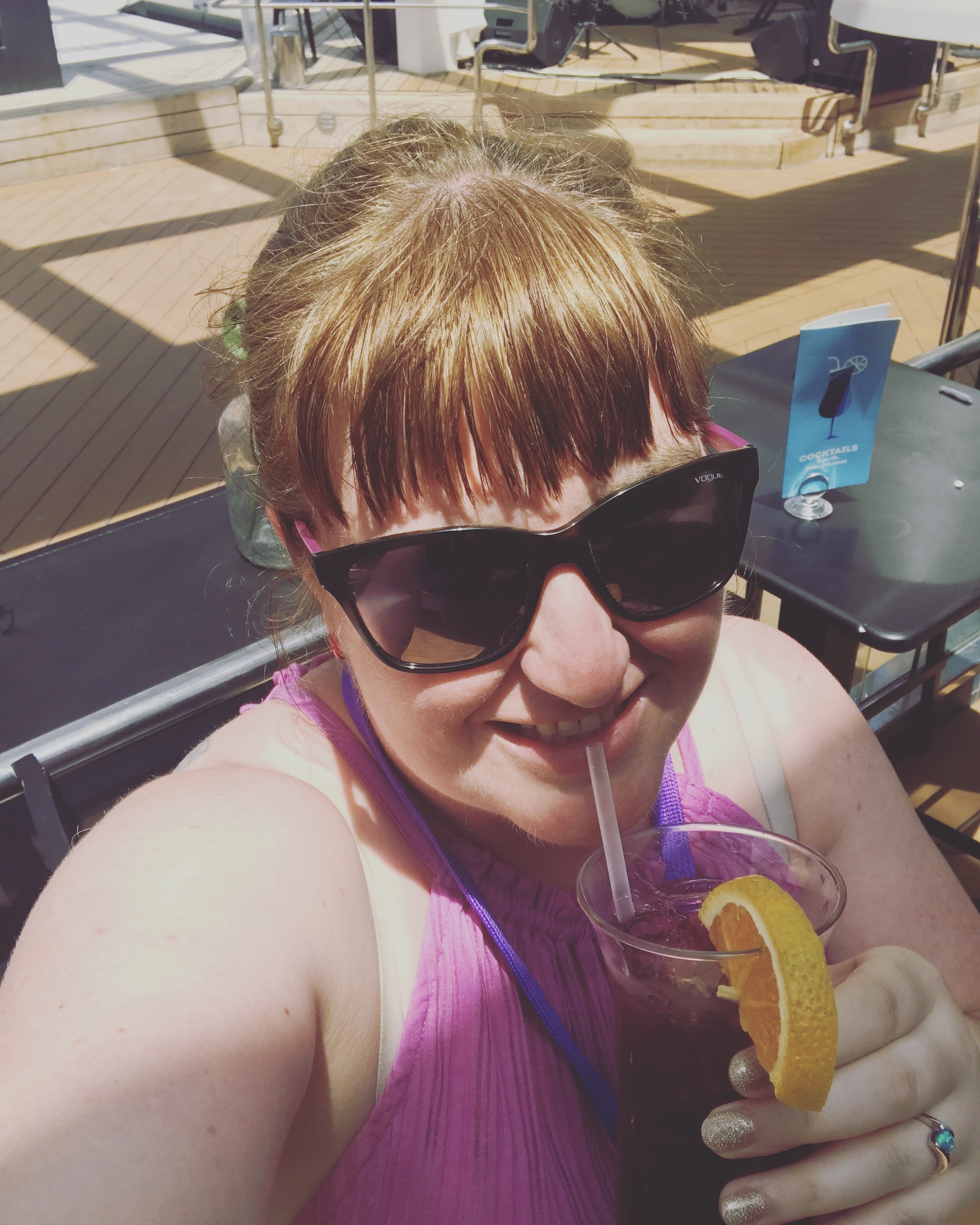 The first thing we did was go and find the reservations desk to book dinner each night, including some of the nicer restaurants on the boat (the ones that charge) like Salt Grill by Luke Mangan and the Chef’s Table. We also booked in for a couples massage at the day spa tomorrow. So far, B’s sea sickness was going well although he was definitely noticing the movement when we were at the far end of this ship. After eating some (free) lunch at The Pantry, which is some kind of disastrous buffet/food court abomination, we decided to numb the motion sensation with a nervous system suppressant – a cocktail! Mmmm.