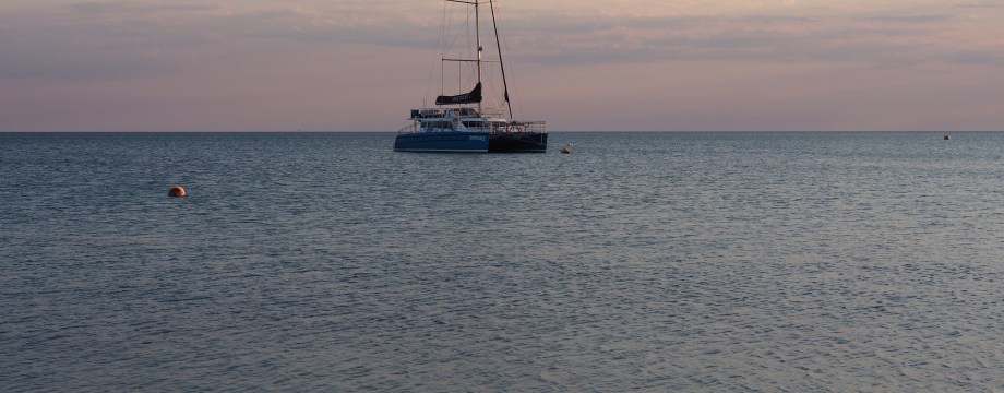 After our dolphin visit we went to brekkie at the local boughshed restaurant and then prepared for our marine reserve catamaran cruise on “Aristocat 2”. This is the only your vessel around here that is legally allowed to enter the conservation zone twice a day. After researching online, it was highly recommended that the morning tour be taken over the afternoon one as you are more likely to see wildlife – although as with all animal cruises they can’t guarantee anything. I was pretty disappointed with this experience to be honest. They obviously can’t control the wildlife but watching the skipper talk to customers for most of the time and not look for any wildlife to point out to us was….disheartening. Letting people ride in the boom net was also a 45 min waste of time that could have been better spent hanging out with some animals! In the end we saw 4 dolphins and 2 dugongs. Photos are terrible.