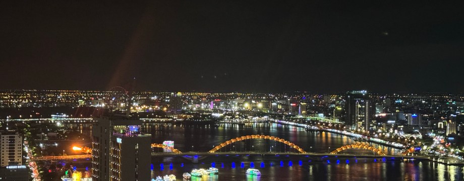 Da Nang is not our usual sort of place. It’s a resort town and has hundreds of expensive high rise beach resorts lined up one after the other. They also block locals from the beach which I’m very opposed to. The tourist stuff around here is very cheesy. With that said, I really needed a decent bed for a night as I am struggling with Vietnamese rock solid mattresses. Our Melia Vinpearl riverside hotel for tonight has very nice beds! And a next level view….