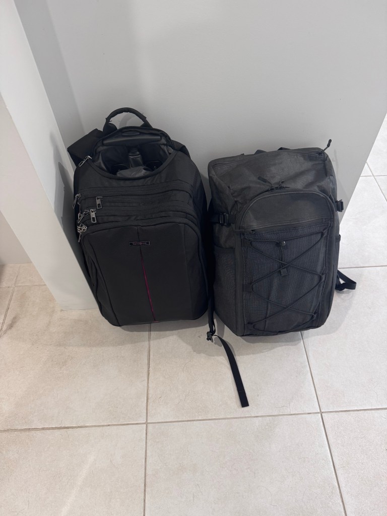 I currently travel with a samsonite wheeled convertible “guardite” backpack which is 29L and B has a ULA Dragonfly backpack which is 26L. I do love my 36L osprey fairview wheeled bag and would take that for a longer trip but the smaller bag was perfect this time.