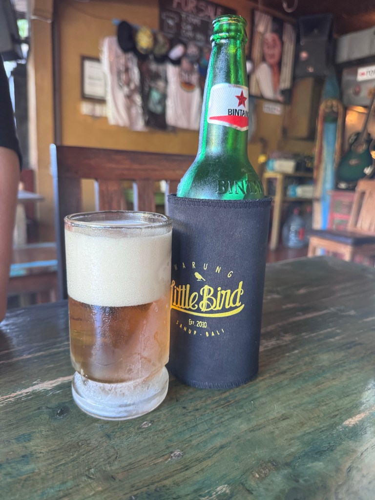 Little bird warung: tasty local food, cold beer, cocktails average. Live music most nights and across the road from Ajanta Villas