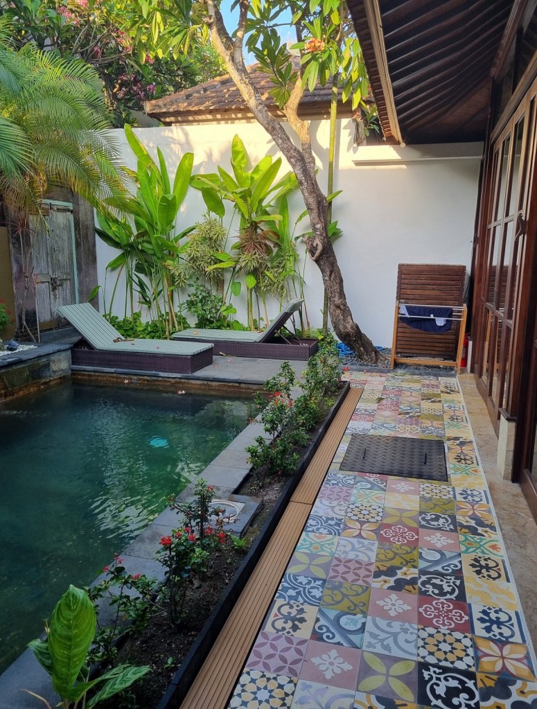 We are staying at Ajanta Villas which we booked through booking . com for about $200 AUD a night. The group of villas is very quiet and each has its own pool. We can exit via a back entrance and walk 50m through a local market for direct access to the beach. It’s an older style villa so wooden furniture, tiled floors and older bathroom fittings with our villa having a separate bedroom and living area / kitchen. I am pretty much living in the private pool and am probably part mermaid by now! I can never go back to shared pools now haha. Some things to be aware of are you do need to walk through the marker to get to the beach / beach restaurants and they hassle you a bit….plus I can see it might be a bit creepy at night. We also have fireworks and dogs barking until about 10pm at night, all of which is very manageable.