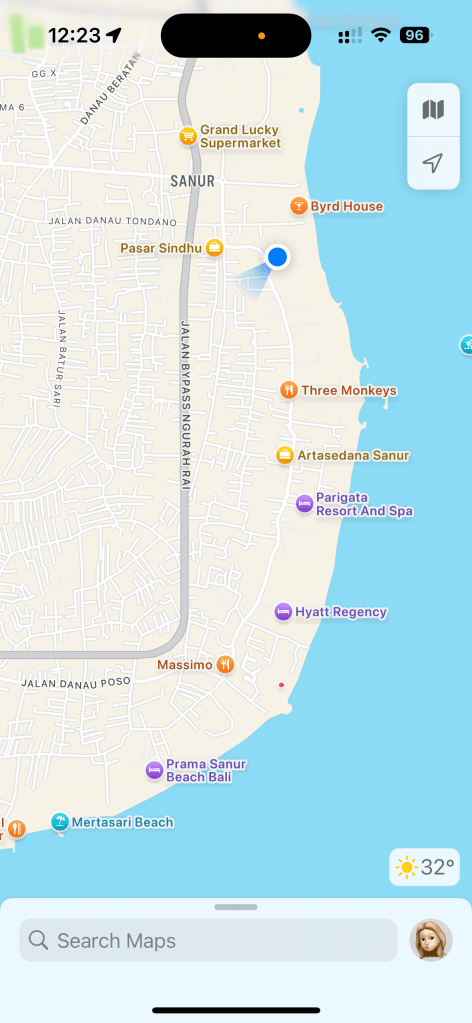 We have spent the past few days relaxing and exploring some of the different restaurants near our villa at the North end of Sanur. We are right up near the top of the main street Jalan Danau Tamblingan and close to the beach (see blue dot on map).
