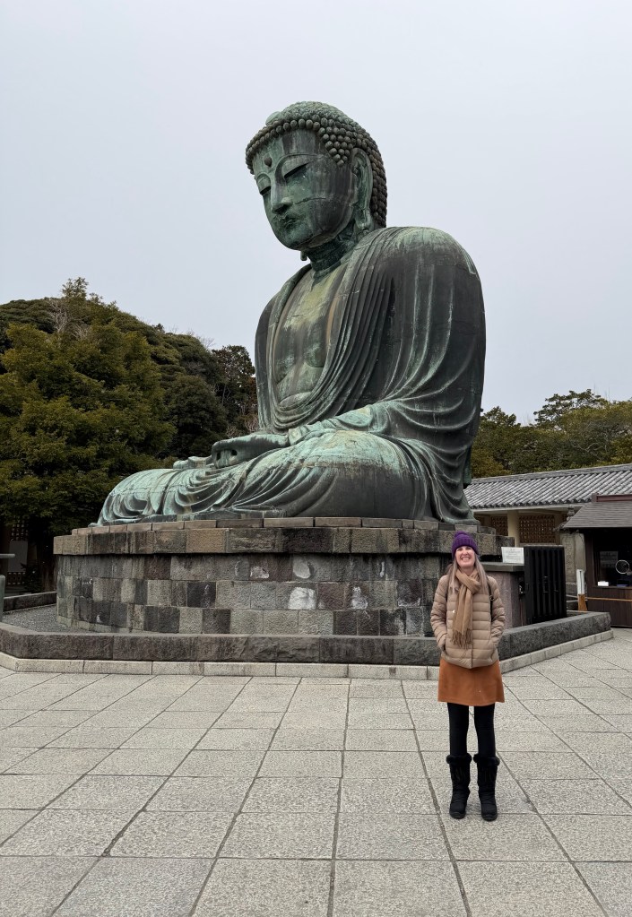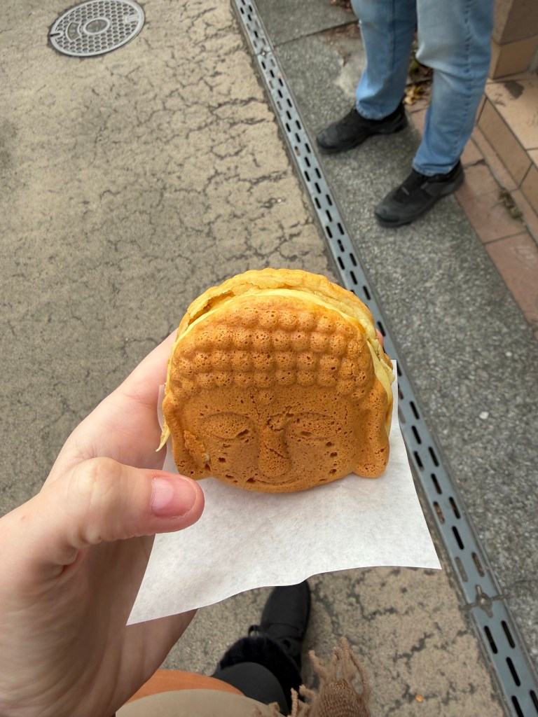 Our last stop was Tsurugaoka Hachimangū Shrine, walking through the big torii gate and into a space that’s all ponds, bridges and gardens. From there we strolled down Komachi Street as well which is apparently shoulder to shoulder in tourist season (spring and summer) but was nowhere near as busy in cold/snowy type weather. I ate a Buddha cake with custard which was tasty and felt slightly sacriligeous.