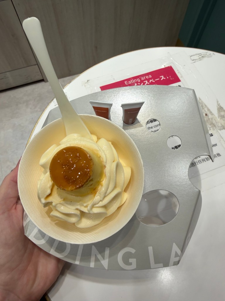 While in Ginza, we also gave pudding lab a go. We tried their most well known gimicky product which is called “100%プリンソフト” (100% pudding soft). It’s not exactly a soft serve ice cream, but more like pudding turned into a soft serve style by liquefying the pudding, then running it through a soft‐serve freezer machine so it comes out creamy, soft, and swirled. You also get to choose two accompanying sauces. It was expensive but I thought it was yummy.