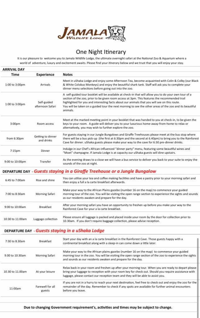 So, we booked in for a night during the September school holidays. They sent us a lot of information beforehand and were very responsive to queries. The schedules they use at the moment are slightly adjusted due to covid 19 but this was our pre-prepared schedule! We also added two extra experiences to this – giraffe encounter and white lion feeding – which were booked in on day 1.
