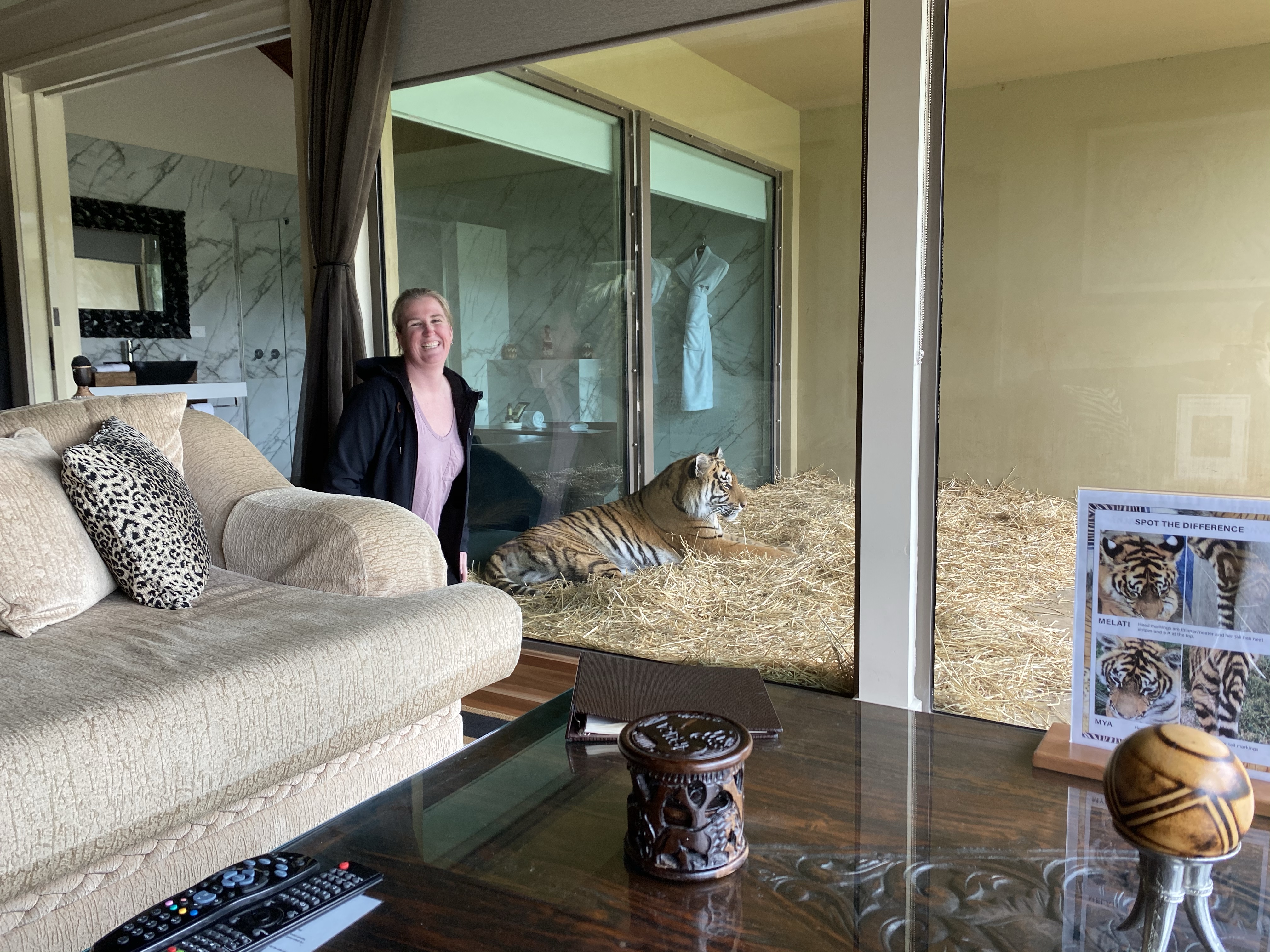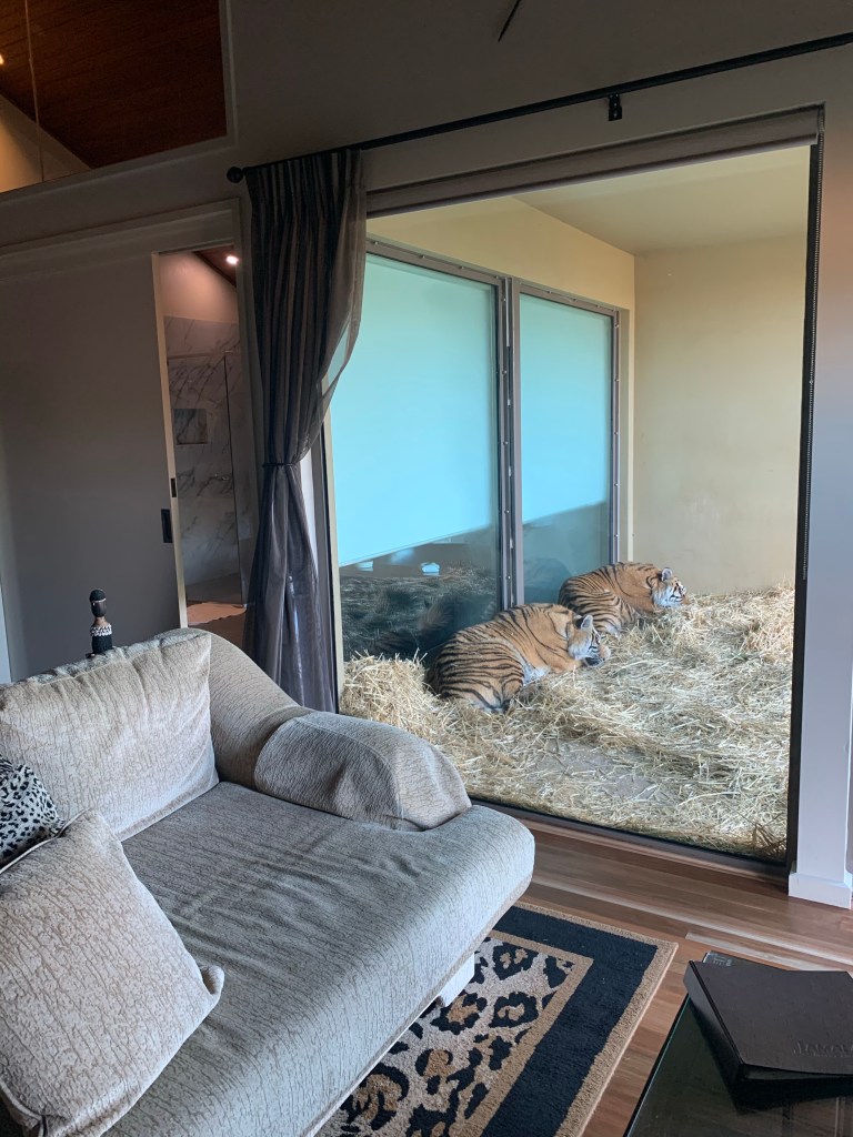 After feeding Jake the very hungry (and demanding!) white lion with his keeper Ryan – the zoo owners son – we headed to Jungle Bungalow 5 with Mya and Melita the toddler tiger twins! I was a teeny, tiny bit excited when we walked in to this….hi there 2 year old 120kg tiger friend!!