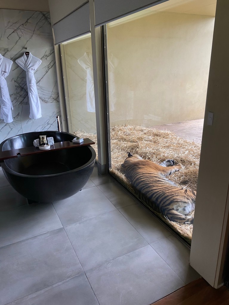 We settled in with a bubble bath, watching tigers wrestle/nap and some champagne to tide us over until dinner. Just before 7pm we were collected and taken to the rainforest cave for dinner alongside the white lions and hyenas. The dinner and drinks were all included and the food was mostly very good – B got unlucky with a not so great steak but mine was delicious – and the paired drink options were all good quality. I haven’t been so full in ages!