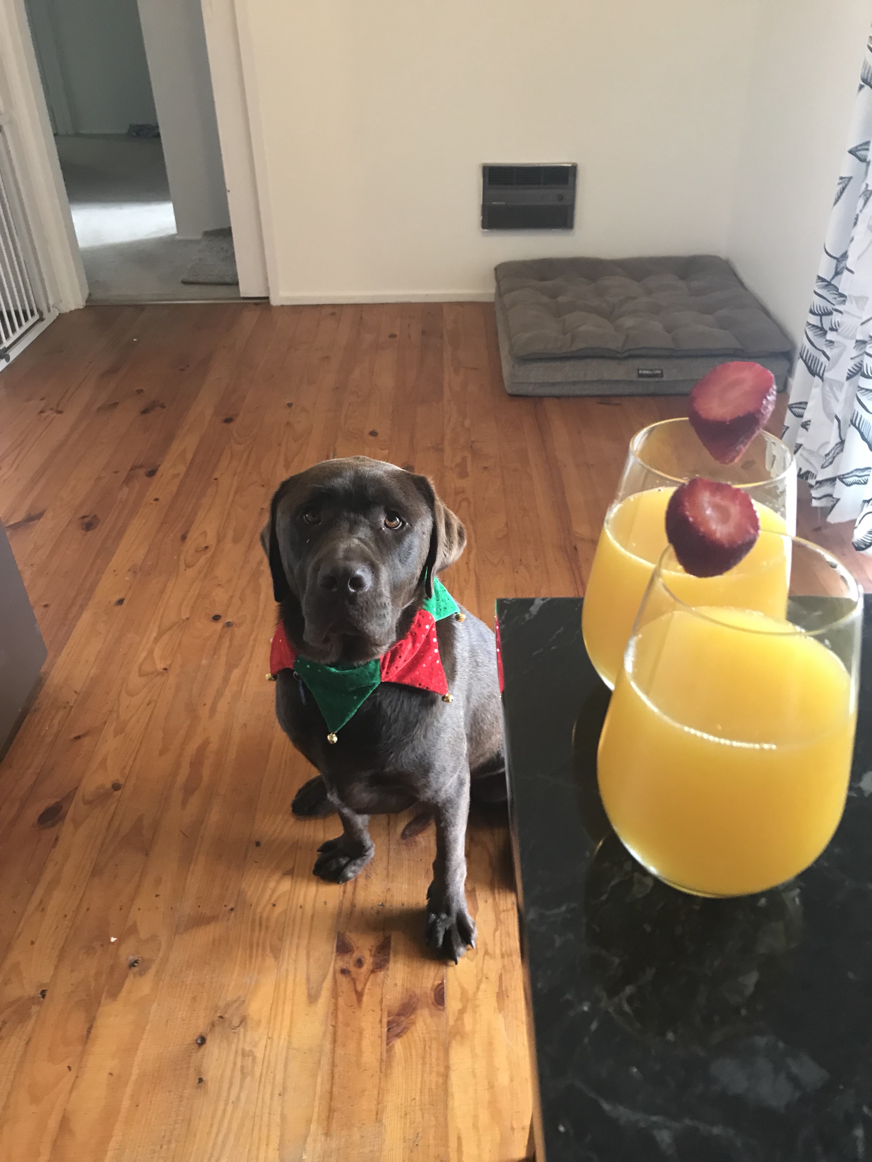 7: 10pm arrive home and be greeted by exceptionally excited doggo who then brings us his Christmas present (rubber chicken) to show off