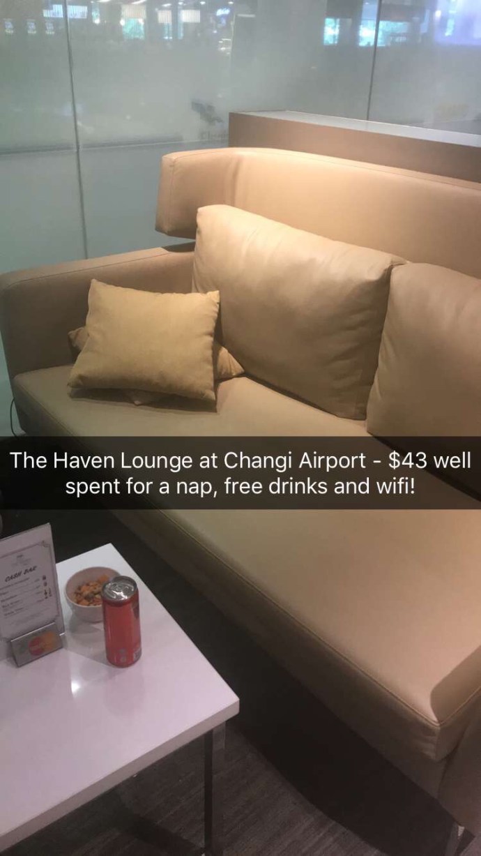 ⁃ Changi Airport has The Haven Lounge which is in arrivals Terminal 3. Although we have qantas club access, we realised we had to clear immigration to get to it….which you can’t do without a boarding pass….which we weren’t going to get until 7:30pm at night! So we discovered this place. Basically you select a time and pay a fee and you can use their guest lounge. They provide free drinks, snacks, lounges, wifi, powerpoints, one shower and one meal. You can also pay a bit more for a nap room. What a good idea!