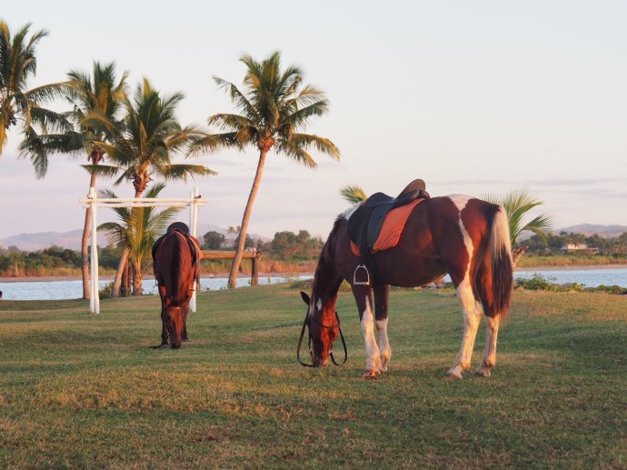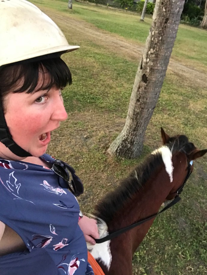 At 2:30pm we headed back to the room to get out of the sun a bit before our sunset beach horse ride. The horse ride was….interesting. Firstly, we ended up with a random 8 yr old kid on the horse ride with us. Alone. Which seemed…somewhat unsafe. It was also not particularly romantic lol. Then, B got the super angry, pregnant horse that kept charging people and got left to control it on his own. THEN it turns out my bad knee means I can’t gat off a horse, even with steps to assist me.