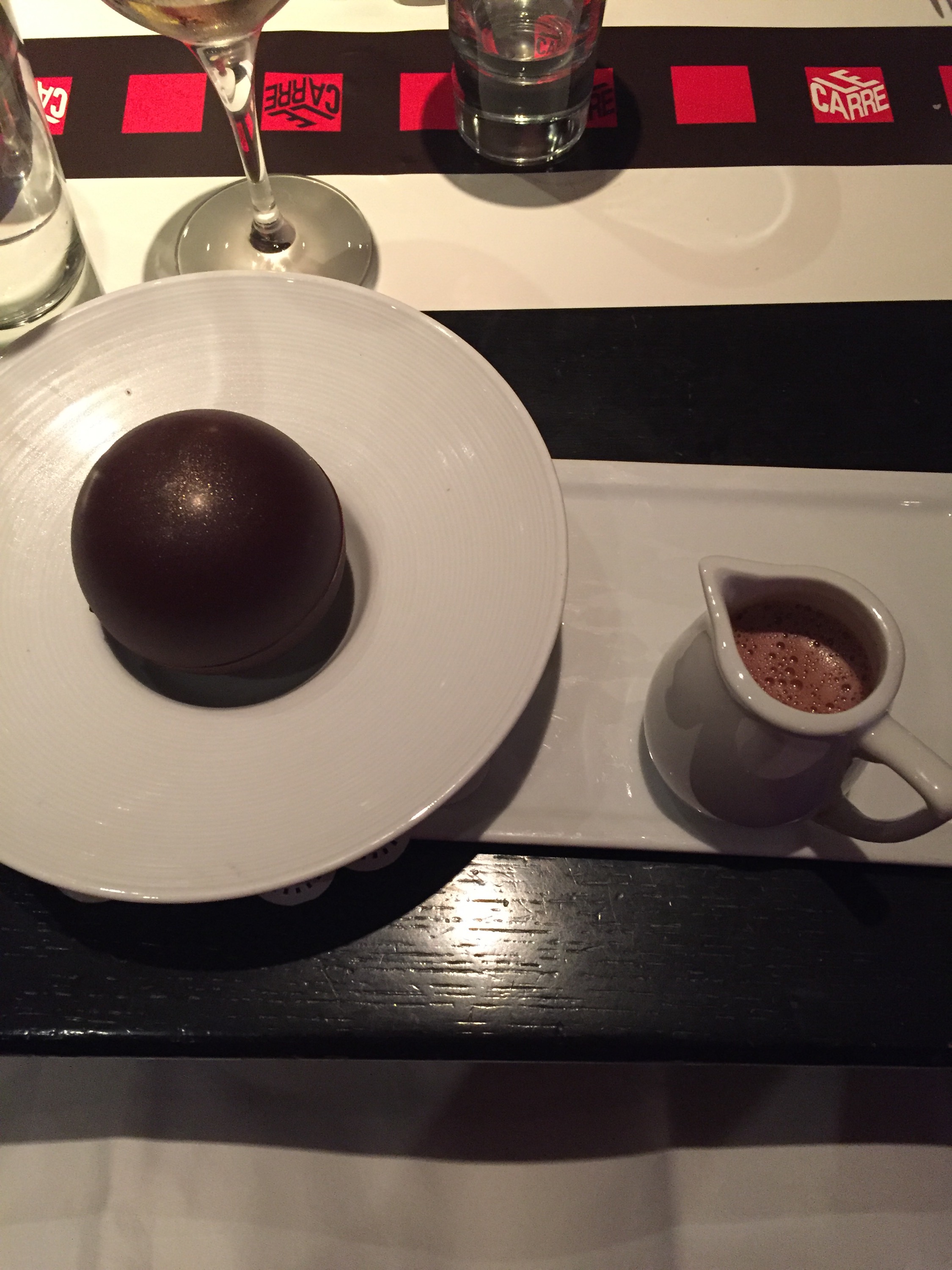 a chocolate ball full of chocoalte mousse and white choc…guess who had this dessert?!