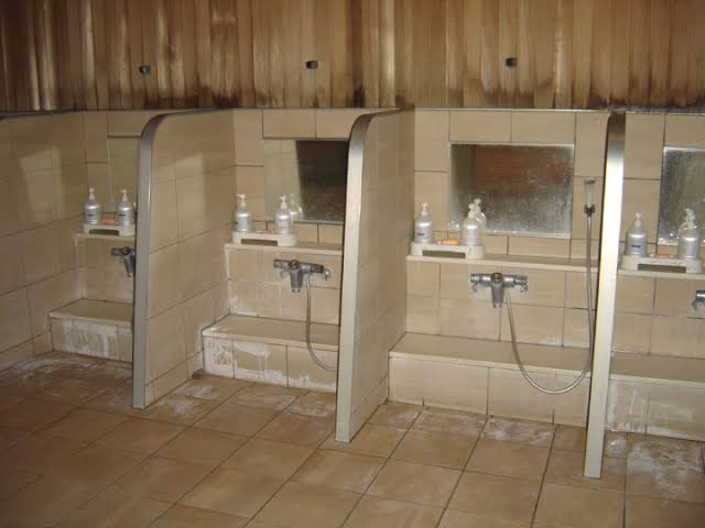5. You will enter the onsen and see a row of small shower cubicles with little seats available. Grab a little seat and pull it up to a shower stall. You then need to completely and totally clean yourself from top to bottom with the provided soaps. And I do mean COMPLETELY and TOTALLY….you need to clean all of your bits thoroughly. You are also meant to wash your hair although many westerners choose to tie their hair up instead. Make sure not to use anyone’s personal cleaning products (Japanese women will often bring these) and to only use the generic ones provided.