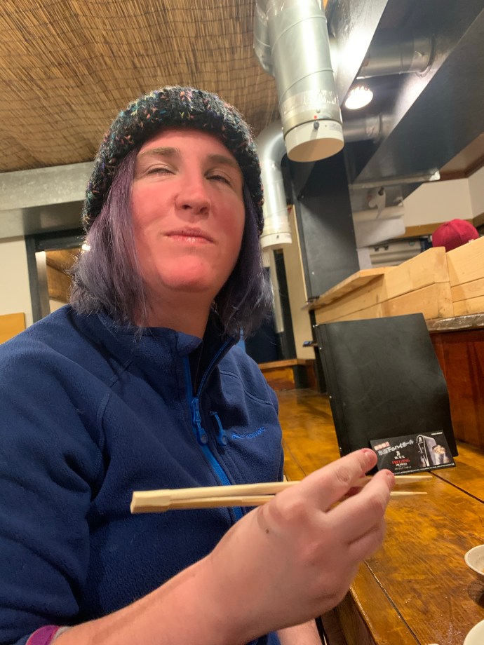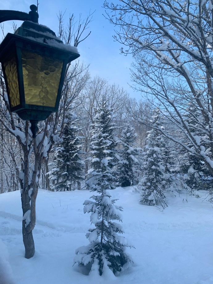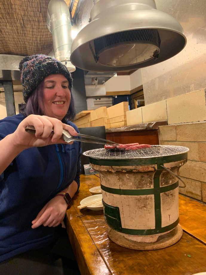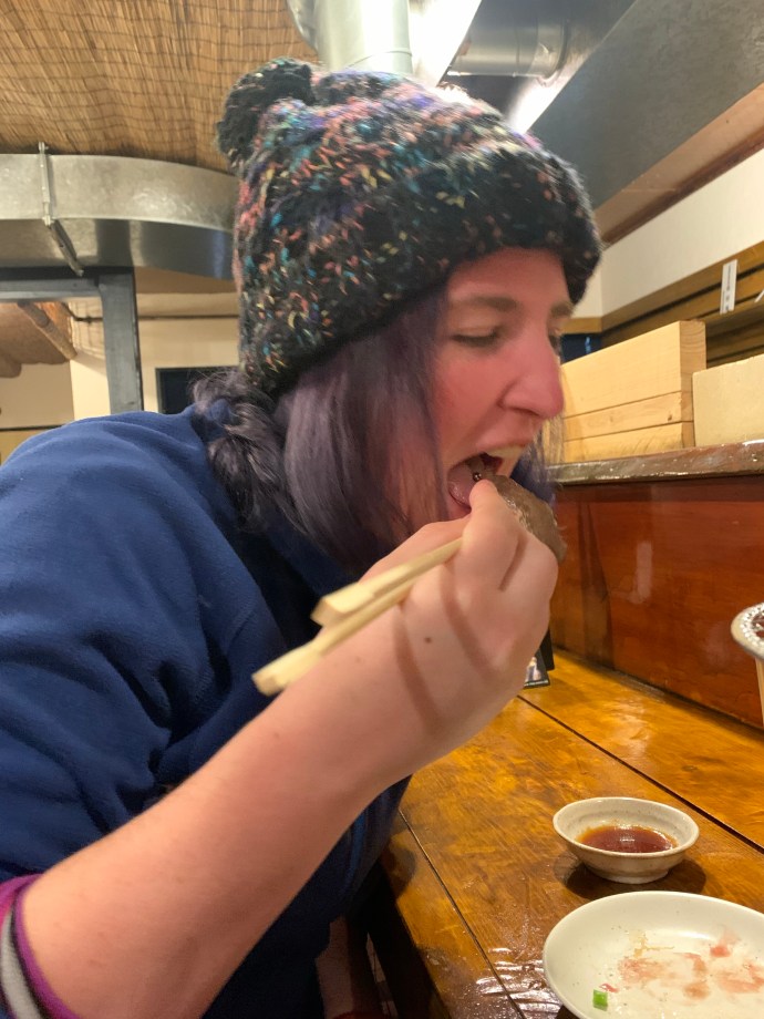 I then walked back down the other side of the main street and caught the train back to Kutchan Station (it’s worth noting the train both ways is insanely busy and some people had to stand the whole 1hr 20 mins) and then the local bus back to the Hirafu Welcome Centre. I arrived about an hour before B was due back from Rusutsu so I checked out the Niseko Alpen Hotel Onsen while I waited for him. It does not have a no tattoos sign but I had mine covered with white bandage tape today. The outside onsen here also looks on to a ski field which was a nice way to pass the time. Costs ¥1000 which is pretty standard tourist pricing.