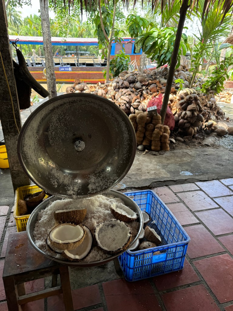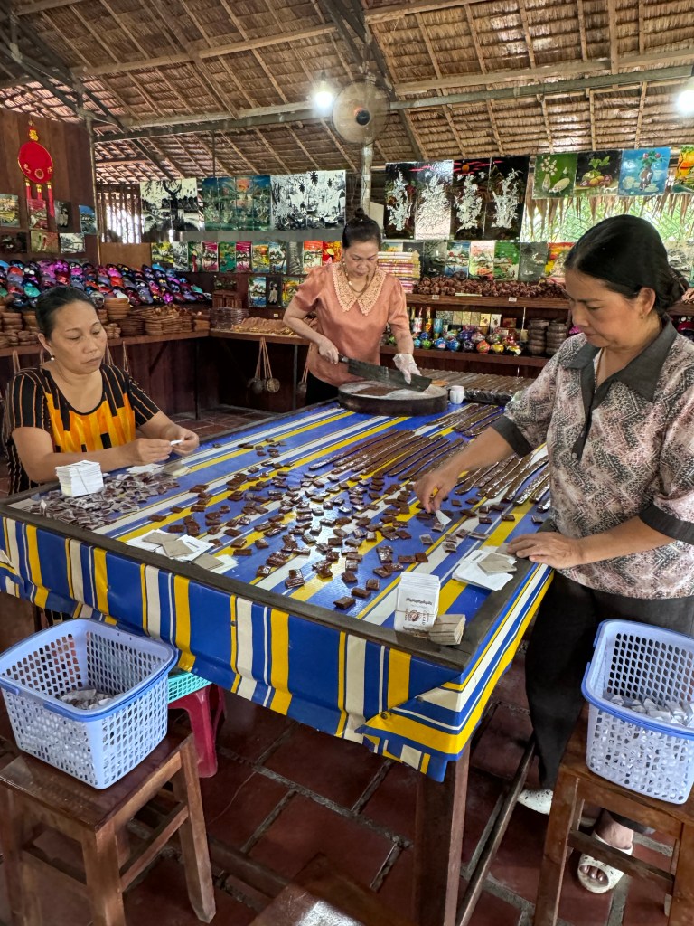 We stopped the boat to visit a coconut candy factory (o bought so much haha) and met some local musicians who performed traditional music. We also sampled some local fruit.