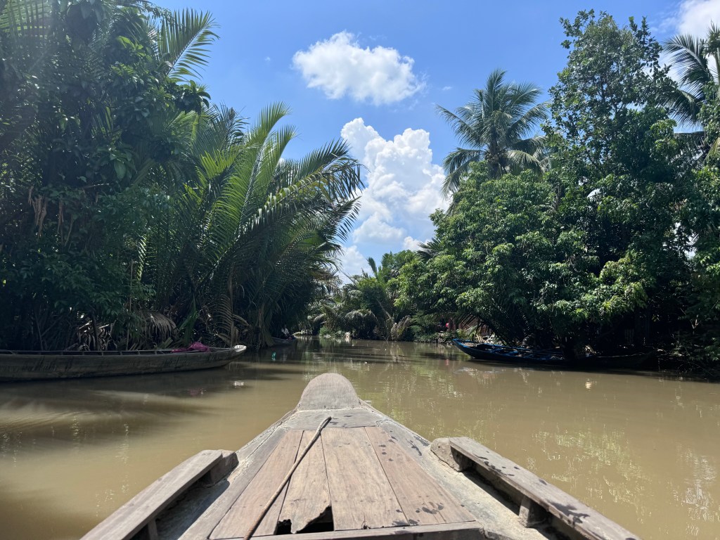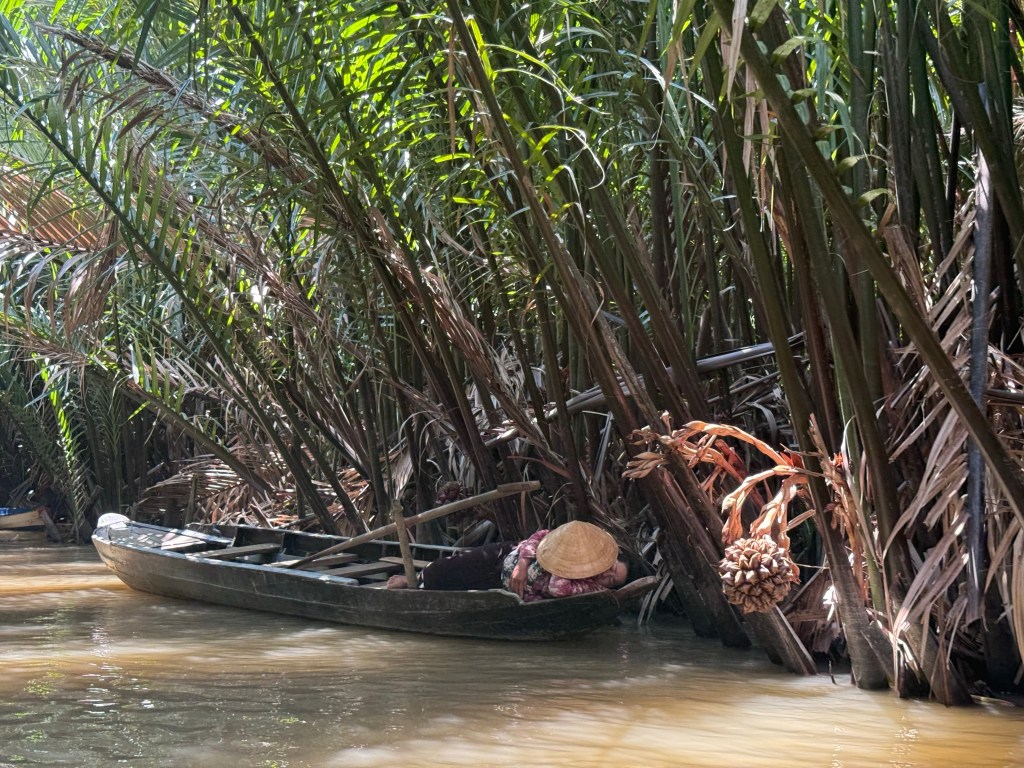 We hopped off the boat and took a Tuk-Tuk (motorized cart) to lunch at a local riverside restaurant. After lunch, we took a rowing-boat (Sampan) along a beautiful water palm creek. We got to say hello to locals…although did it quietly as many were having post-lunch naps on their sampans!