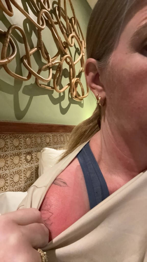 Home arrival time is midnight tonight…and I have a work meeting at 8:30am tomorrow. Then I fly to Brisbane the next day for a week at a conference. Lucky me! Also travelling with this sunburn is hideously uncomfortable. Do not recommend.